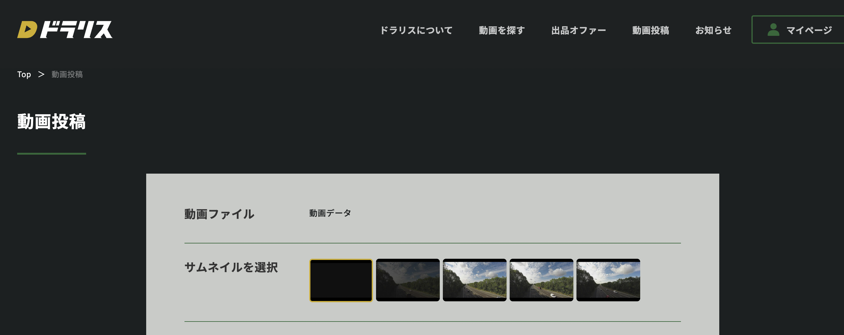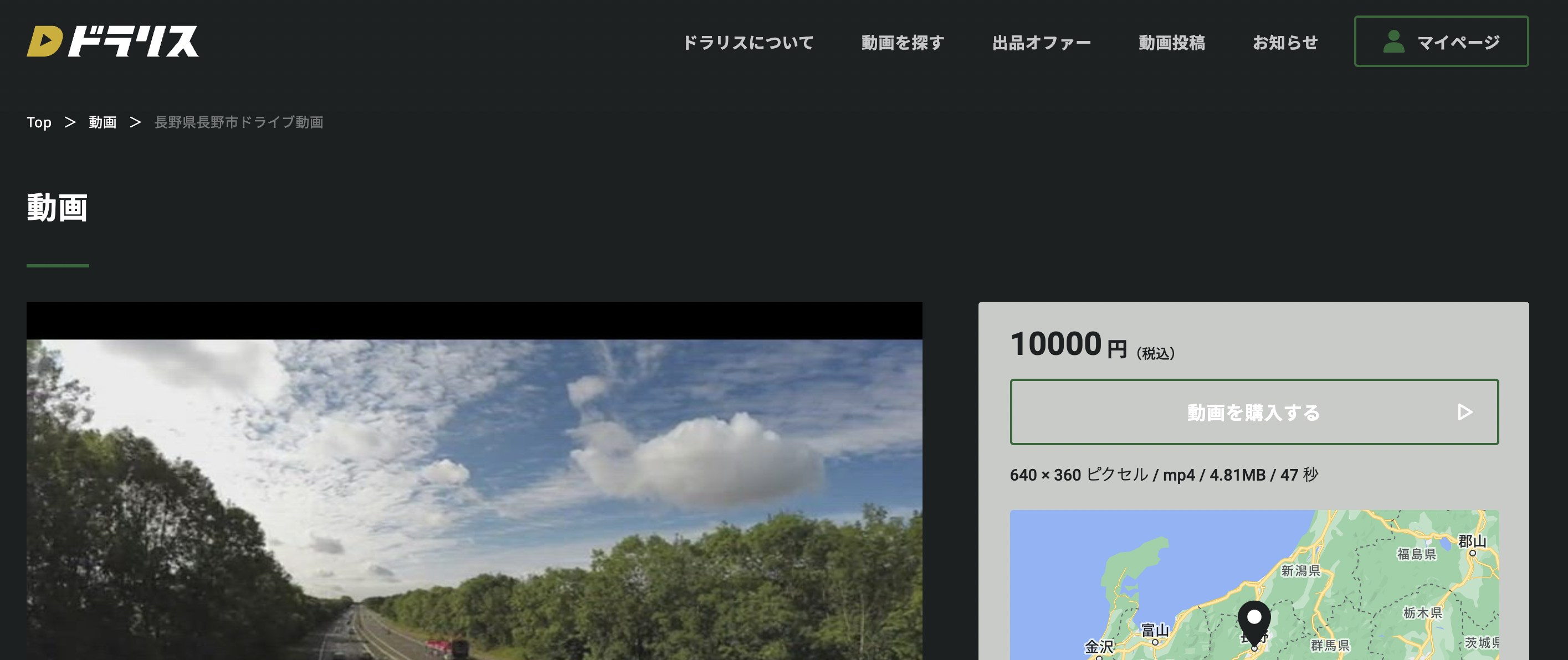 ドライブレコーダー映像等を投稿・購入するためのマーケットプレイス ●動画商品 ドライブレコーダー映像等 ●価格帯 投稿者が価格を設定(最低価格10,000円) ※販売手数料として商品代金の22%(消費税込み)が発生します(購入時に手数料は発生しません)