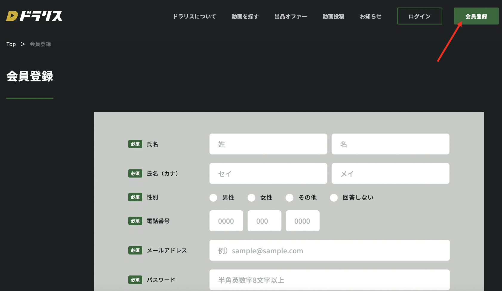 1. 画面右上の[会員登録]ボタンをクリックもしくはタップする